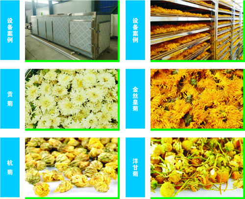 新鮮菊花含水量較高,其中花瓣部分含水量較少,組織較嫩,容易干燥,而花頭部分含水量特大,可達80%以上,且組織較老,不易失水,菊花是一種組織極不均勻的藥材。因此,遠圖菊花烘干機對芘頭部分進行強干燥,而對花瓣部分進行弱干燥。烘出的菊花色澤金黃,花香濃郁,花芯不散。